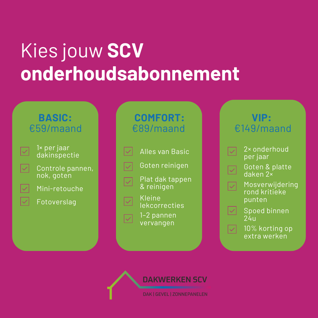 Een dak beschermt je woning elke dag en krijgt daarbij heel wat te verduren. Regen, wind, storm, zon en mos kunnen op termijn schade veroorzaken zonder dat je het meteen merkt. Kleine problemen groeien snel uit tot dure herstellingen. Daarom introduceert SCV Dakwerken SCV DakZorg, een onderhoudsabonnement dat jouw dak in topconditie houdt voor een vaste prijs per maand.